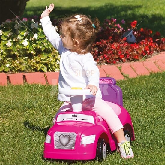 Auto guralica prelepog dizajna pružiće devojčicama odličnu zabavu i pomoći im u prvim samostalnim koracima. Doprinosi zdravoj aktivnosti koja je važna za pravilan fizički razvoj svakog deteta. Sirena na volanu i prostor za odlaganje ispod sedišta omogućuju raznovrsnost igre.