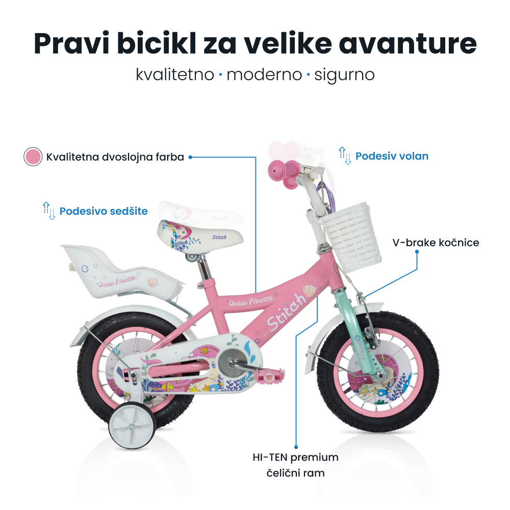 Ovaj 12-inčni bicikl za decu predstavlja najbolji poklon kome će se radovati sve devojčice uzrasta od 2 do 4 godine. Dizajn ovog bicikla čine motivi sirene koji se predivno preslikavaju duž cele bicikle koja je roze boje. Dizajn sa niskim prelazom idealan je za Vaše dete i omogućava lakše penjanje i spuštanje svakoj devojčici na ovu dečiju biciklu.