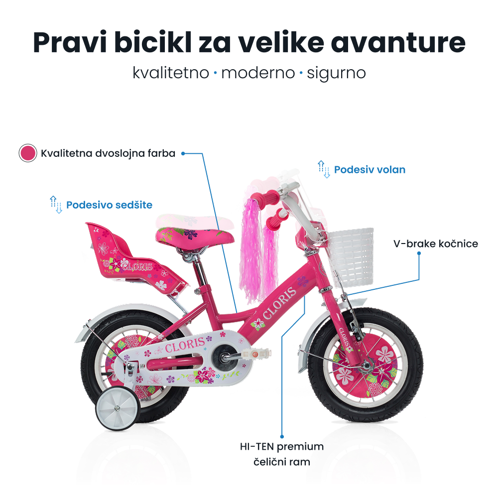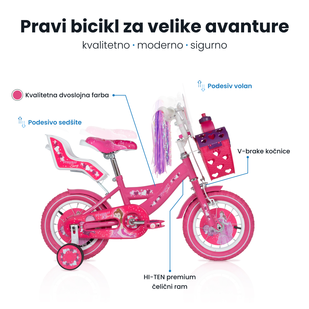 Ovaj  bicikl je savršen poklon za svaku devojčicu uzrasta od 2 do 4 godine. Njegova prednja korpa u obliku srca i ugradna flašica za vodu u sklopu korpe čine ga ne samo funkcionalnim, već i izuzetno šarmantnim. Dizajn sa niskim prelazom omogućava jednostavno penjanje i silazak, pružajući detetu potpunu slobodu da uživa u vožnji sa lakoćom i sigurnošću.