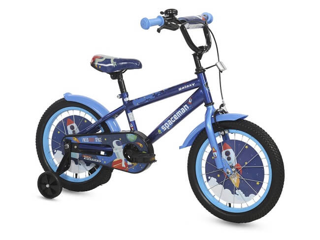 Dečiji  bicikl SPACEMAN 16″ je namenjen deci koja tek uče da voze bicikl. Prečnik točka iznosi 16 inča. Bicikl ima pomoćne točkiće koji pomažu detetu da održava ravnotežu tokom učenja vožnje i omogućavaju mu da stekne neophodno samopouzdanje kako bi dete moglo samostalno da vozi.