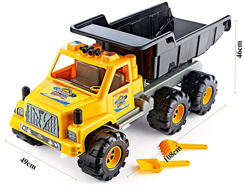 Veliki kamion za mališane za kvalitetnu zabavu opremljen prikolicom za istovar i alatom u vidu lopate i grabulje. Velika nosivosti i velike dimenzije mališanima obezbeđuju dugu upotrebu.