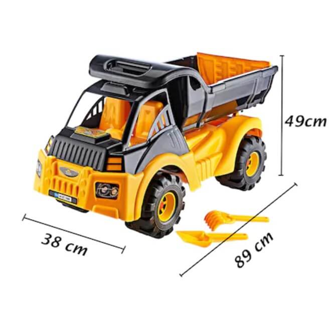 Kamion za mališane opremljen prikolicom za istovar i alatom u vidu lopate i grabulje. Lako prenosiv, pogodan za kućnu upotrebu, a posebno za zabavu u dvorištu ili avanturu u pesku.