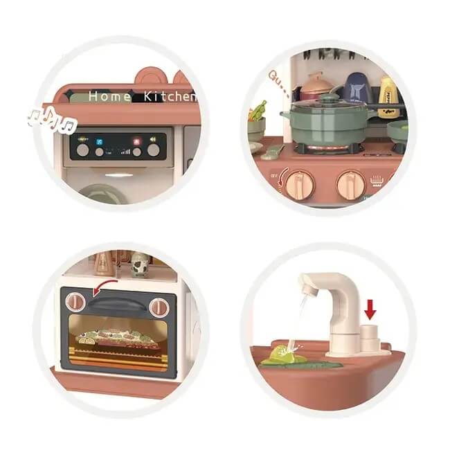 Ova zabavnaa igračka sadrži sve što poseduje i prava kuhinja: ringle, police, sudoperu, posuđe , namirnice. Zabava igranja postaje još realističnija uz muzičko-svetlosne efekte koji se postižu na ringli kao simulacija „krčkanja hrane“. Kuhinja ima i mogućnost rada slavine jer je moguće povezati vodu sa istom.