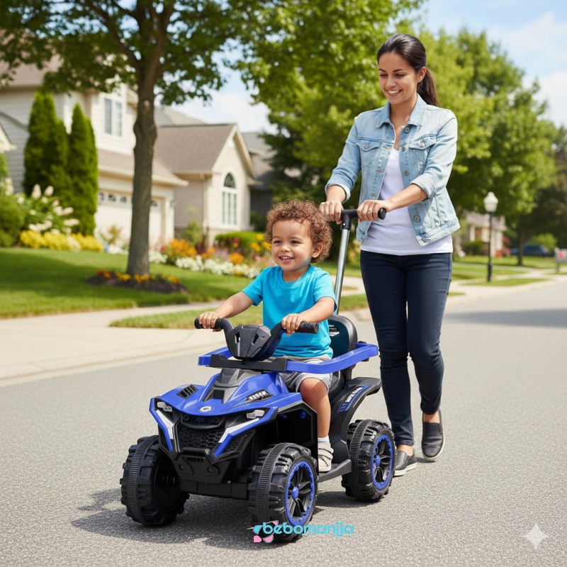 Kvad na akumulator MB4825T plavi namenjen je deci do 4 godine starosti. Mogu ga koristiti čak i bebe od godinu dana ukoliko stabilno sede, jer poseduje ručku za upravljanje, tako da roditelji mogu pomagati u vožnji mališanima koji još uvek nisu dovoljno samostalni.