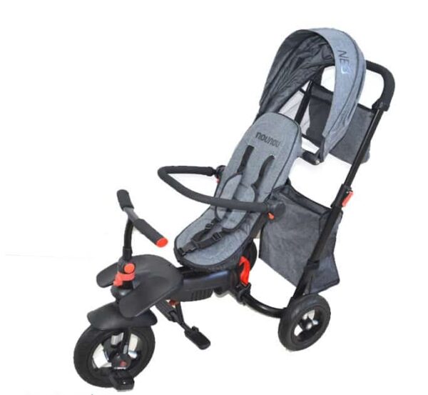Sklopivi Tricikl NouNou NEO predstavlja najfunkcionalniji tricikl za decu prestižnog brenda NouNou. Dečiji je tricikl 3u1 jer je sklapajući, oboriv i rotirajući. Specijalno je dizajniran za svakodnevni prenos i putovanja. Njegova brza i jednostavna funkcija sklapanja omogućiće da ga ponesete gde god krenete, kao kofer, zauzimajući u gepeku veoma malo prostora. U avionu ga možete uneti kao ručni prtljag čije su dimenzije u skladu sa zahtevom avio kompanija za odlaganje u kabini. Sedište može da se rotira za 360 stepeni tako da dete gleda unapred ili ka roditelju. Ovaj tricikli ima oboriv naslon sedišta koji pruža mališanima optimalni komfor tokom vožnje. Dizajneri su mislili i na bezbednost mališana, pa je tricikli za decu jedan od retkih modela sa sigurnosnim pojaom u 5 tačaka. Dodatnu udobnost obezbeđuju i točkovi gumenog EVA punjenja koji nesmetano prelaze i preko neravnog terena.
