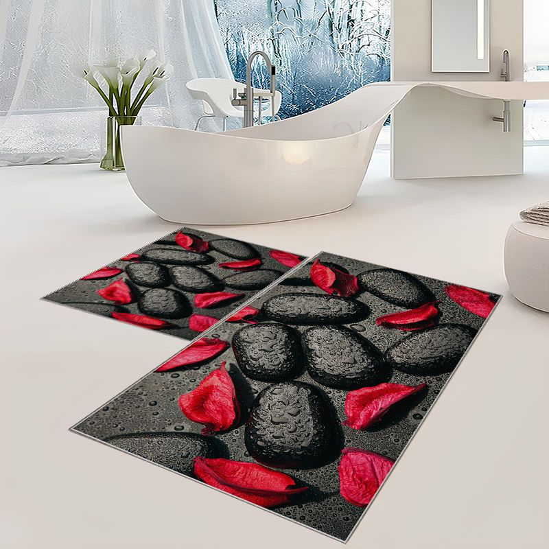 Set za kupatilo Crvene latice obuhvata dve staze različitih dimenzija koje će se uklopiti u svako kupatilo, malo ili veće. Njegov dizajn sa kamenčićima i laticama koji asocira na opuštanje i uživanje u kadi, ukrasiće kupatilo.