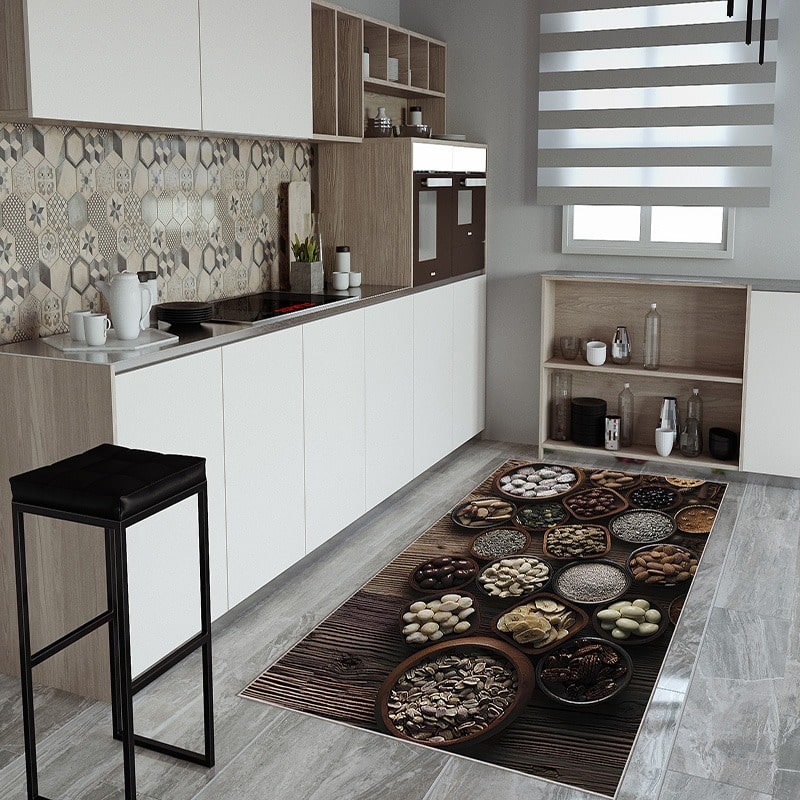 Staza 60x140cm Posude sa začinima KG-036, sa 3D printom i neutralnim dezenom, idealna je za vašu kuhinju. Podsetiće vas na tradicionalne detalje u kuhinjama vaše mame ili bake. Idealna za osobe koje ne žele klasičan minimalizam, ali ne žele ni previše šarenih detalja u svom enterijeru.