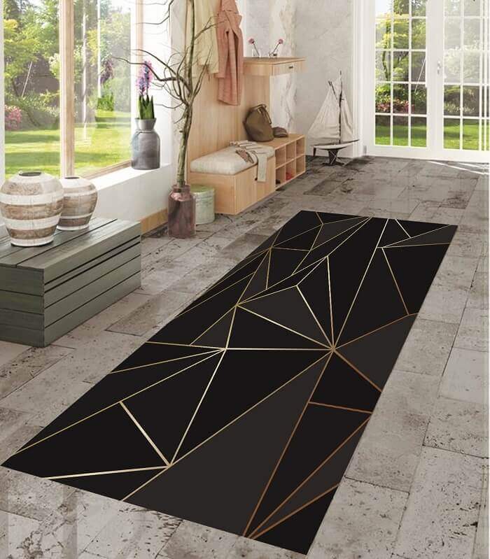Staza Crni trouglovi SH-018 je neklizajuća staza crne boje sa zlatnim detaljima dimenzija 80x200cm, koja će vašem hodniku ili spavaćoj sobi dati moderan izgled.