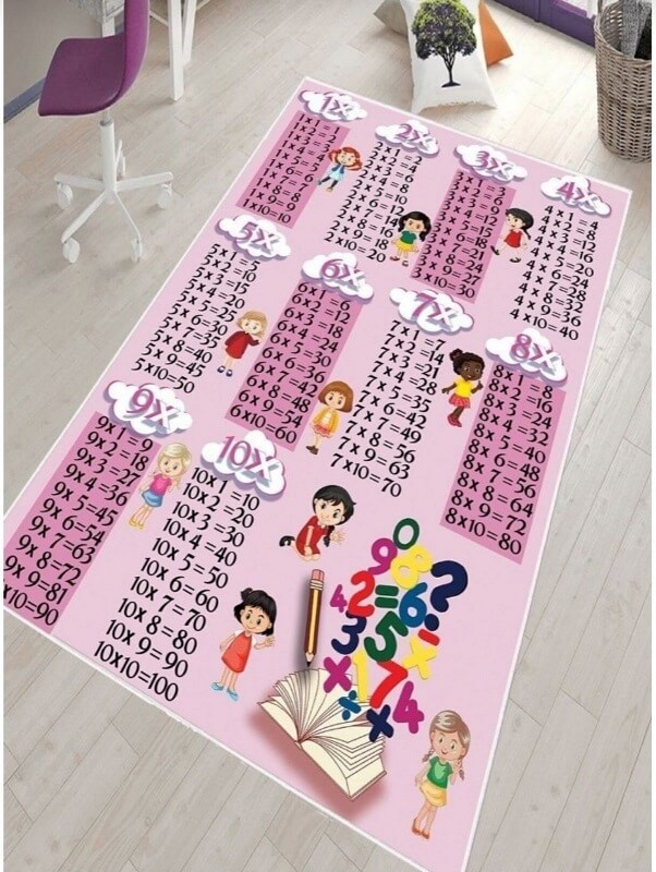 Tepih sa gumenom podlogom, dizajniran motivom tablice množenja u nežno roze boji, učiniće im učenje matematike zabavnim i lakim. Gumena podloga garantuje da će decojčicama zimi biti toplo, a leti prijatno dok budu sedele i igrale se na ovom tepihu.