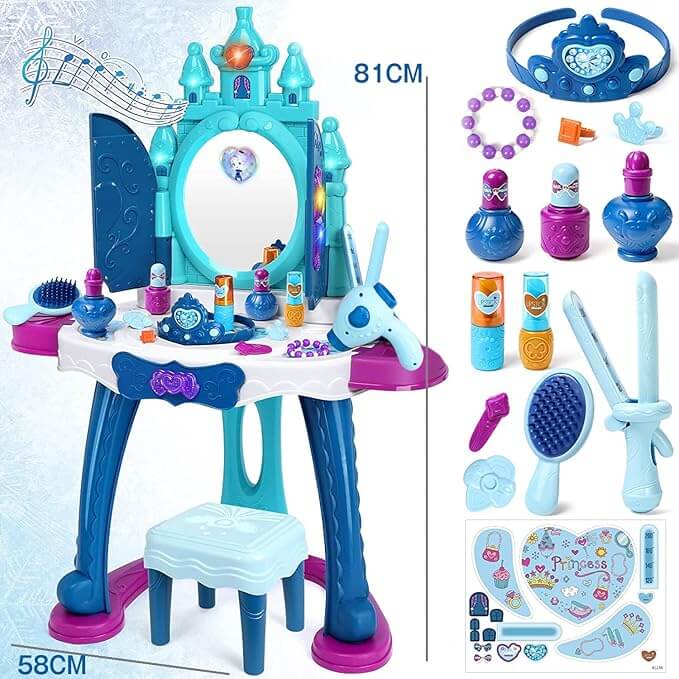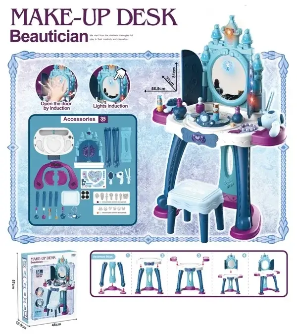 Sto za ulepšavanje sa ogledalom i stoličicom prelepog dizajna namenjen devojčicama za višesatnu igru i razvoj mašte. U setu dolaze dodaci kao što su fen  i presa za kosu, lakovi, parfemi, pa se vaše princeze mogu ulepšavati zajedno sa svojim drugaricama.