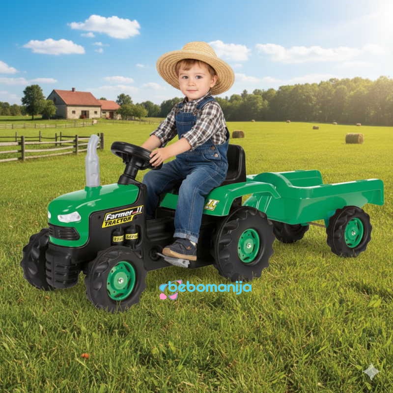 Traktori za decu Farmer 080530 su dečija vozila namenjena malim farmerima koji vole da istražuju u prirodi. Pogon je na pedale koji zajedno sa volanom omogućuje lako upravljanje i okretanje. Opremljeni su funkcionalnom prikolicom pa su spremni za sve radove u dvorištu. Prikolicom se mogu prenositi lišće, pesak, kamenčići, ali i omiljene igračke mališana. Prikolica se može otkačiti prema potrebi mališana i njegove kreativne zabave. Veliki točkovi lako prelaze i preko neravnog terena što doprinosi laganoj, a uzbudljivoj vožnji. Sedište se može uzdužno pomerati i tako prilagođavati rastu deteta. Na volanu se nalazi taster za sirenu što naročito doprinosi zabavi najmlađima.