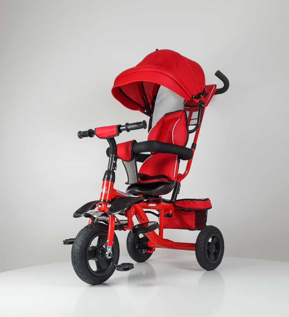 Roto sedište omogućava da dete bude okrenuto ne samo u pravcu kretanja već i ka mami ili tati. Tricikli ima dodatno postolje za noge kada je beba još mala. Točkovi od pune gume garantuju udobnu vožnju po neravnim terenima. Ovaj tricikl spada u grupu tricikala najveće nosivosti jer ima jaku metalnu konstrukciju. Svi prateći elementi se mogu demontirati i ostaje klasičan tricikl koji će dete samostalno da vozi.
