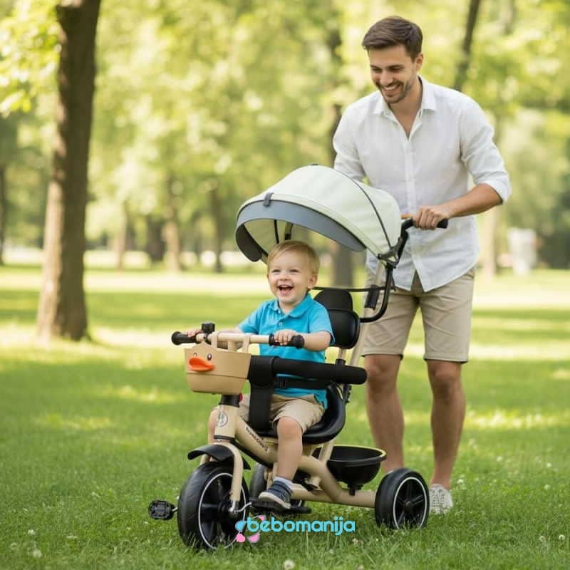 Tricikl za decu 4002 bež možete koristiti kao klasičnu guralicu dok dete ne napuni 2 ili 3 godine, a kasnije skinuti ručku za guranje, sigurnosni obruč i tendu i dobiti tricikl kojim će vaše dete razvijati motoriku i koordinaciju.